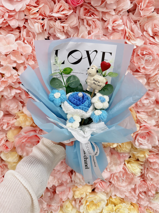 淺藍色|畢業男仔頭|太陽花|向日葵|畢業花束|畢業禮物|針織花 編織花束|人手製作|觀塘花店