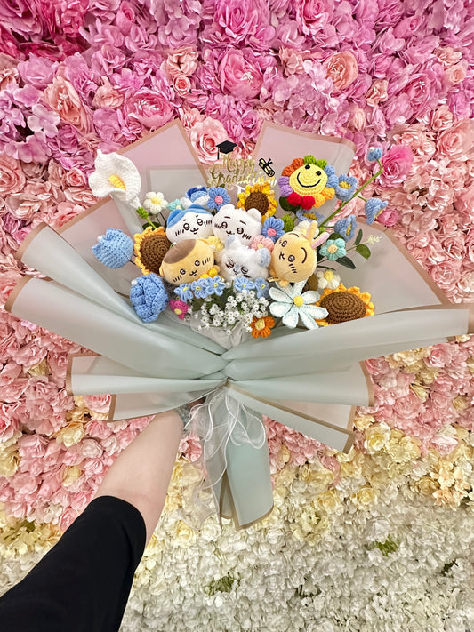 XL Size「Chiikawa 全家福一家親」吉伊卡哇公仔花束大集合| 小八兔子烏薩奇+小八貓+吉伊卡哇+飛鼠+栗子饅頭 5隻角色一家親公仔花束|畢業花束|向日葵|網上訂花|針織花束|生日花束|週年紀念日花束|情人節花束|感謝Farewell花束|即日送花|香港花店|觀塘花店