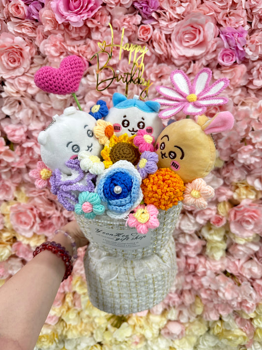 「Chiikawa 全家福一家親」吉伊卡哇公仔花束大集合| 小八兔子烏薩奇+小八貓+吉伊卡哇+飛鼠+栗子饅頭 5隻角色一家親公仔花束|畢業花束|向日葵|網上訂花|針織花束|生日花束|週年紀念日花束|情人節花束|感謝Farewell花束|即日送花|香港花店|觀塘花店