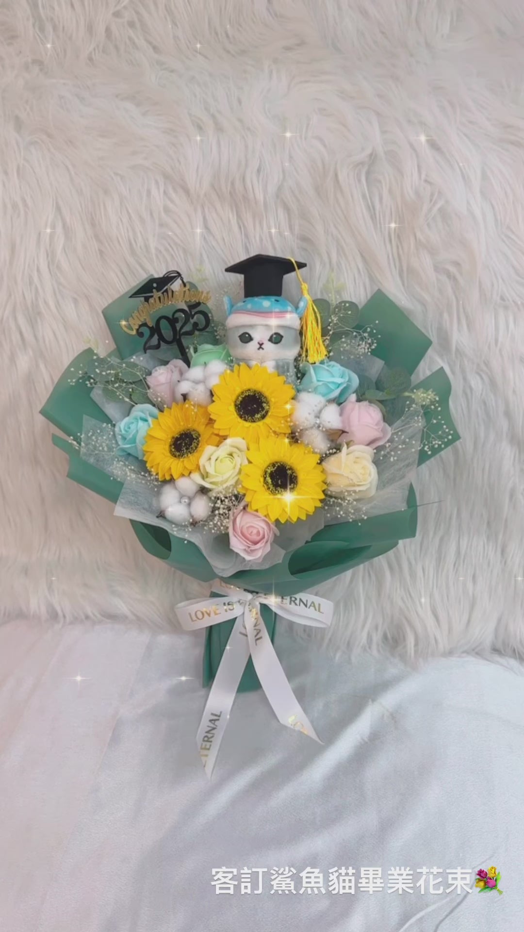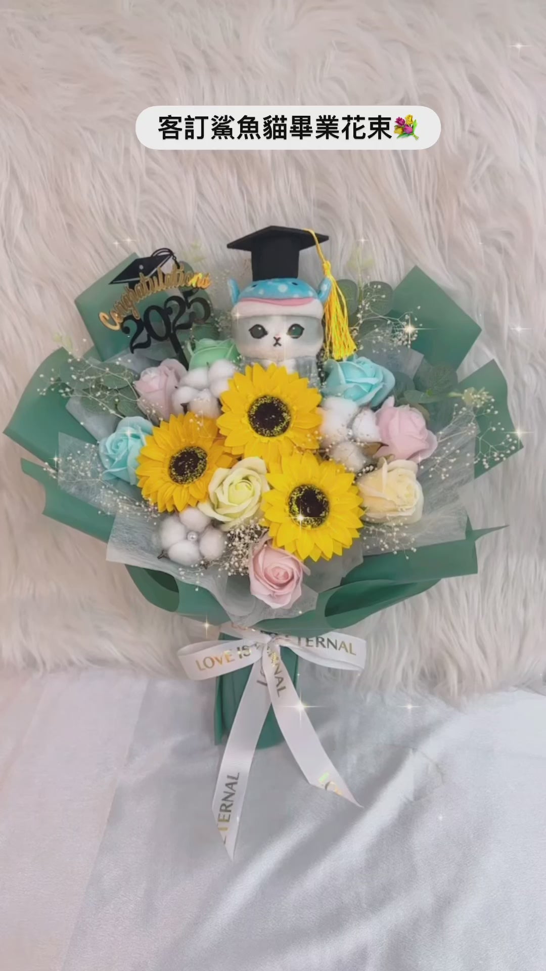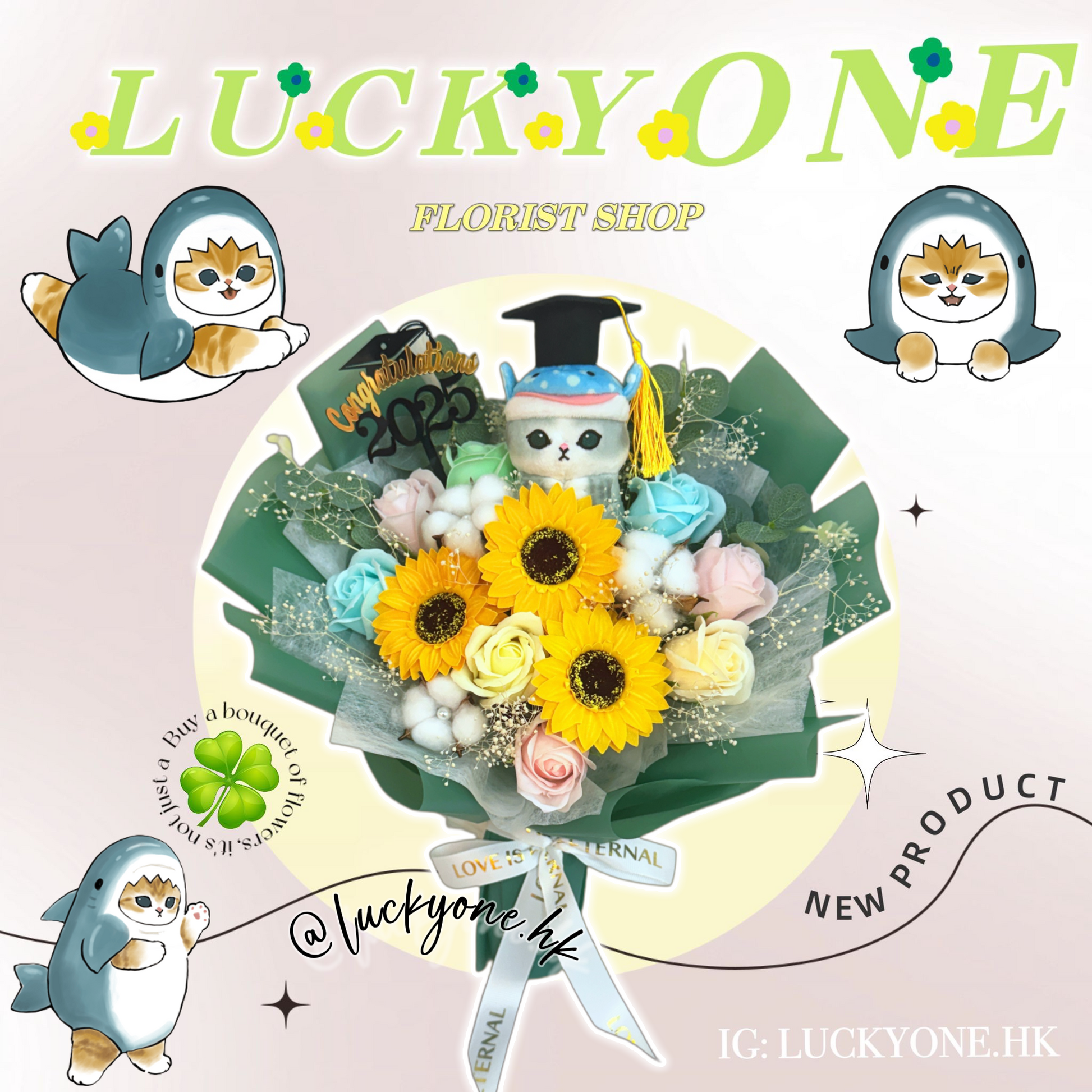 Mofusand 鯊魚貓畢業公仔花束|向日葵|畢業花束|畢業禮物|畢業公仔花束|網上訂花|太陽花玫瑰皂花|香皂花|肥皂花|番梘花|乾燥花|乾花|乾花花束|網上花店|香港花店|即日送花|觀塘花店