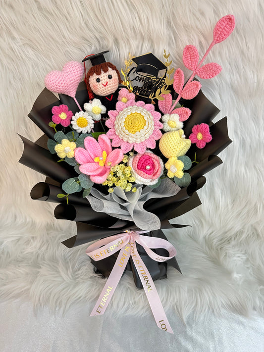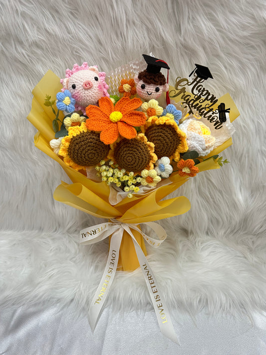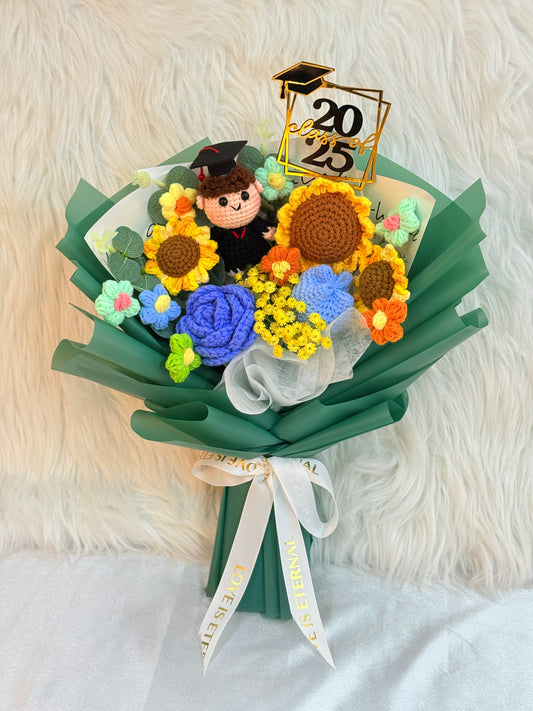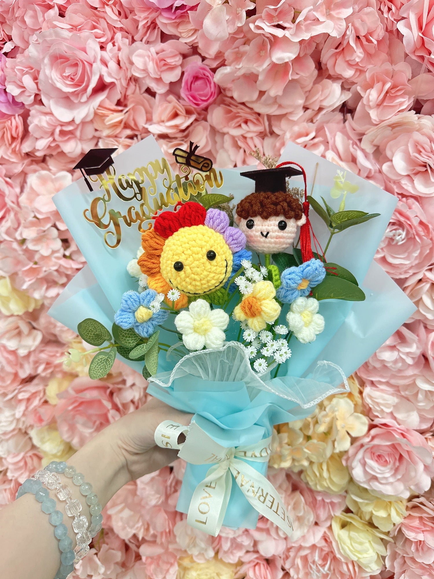 畢業男仔公仔頭 太陽花|向日葵|畢業花束|畢業禮物|畢業公仔|針織花束 編織花束 鈎織花束|幼兒園 小朋友畢業花|人手製作|網上花店|香港製造|觀塘花店