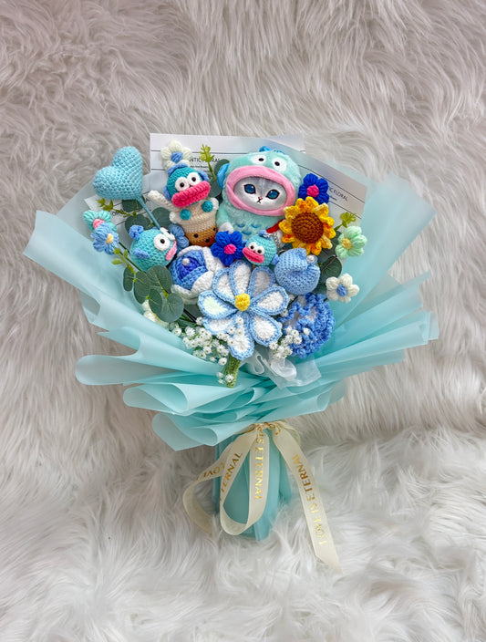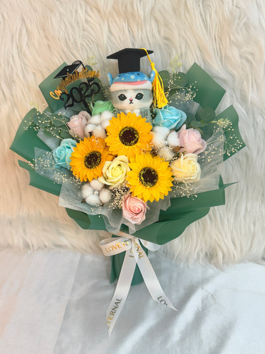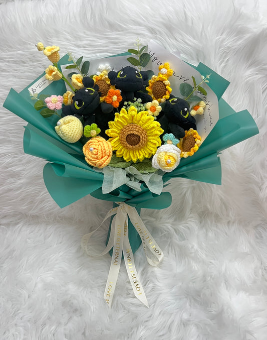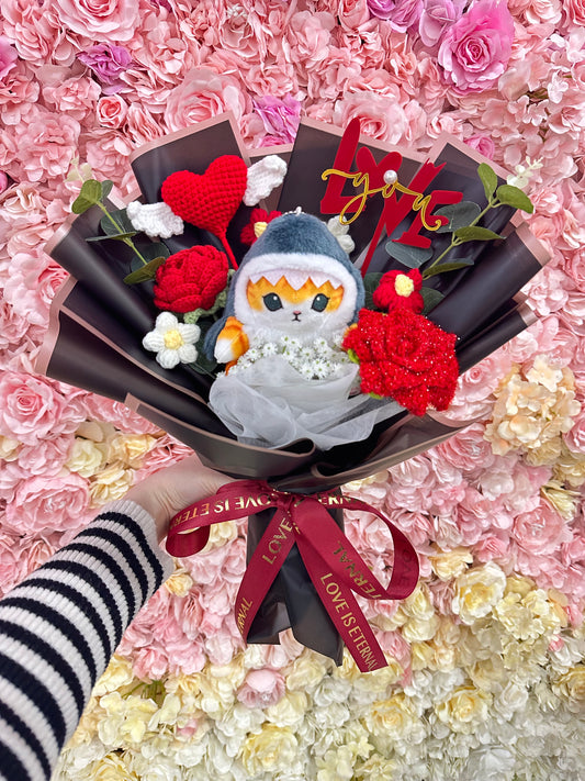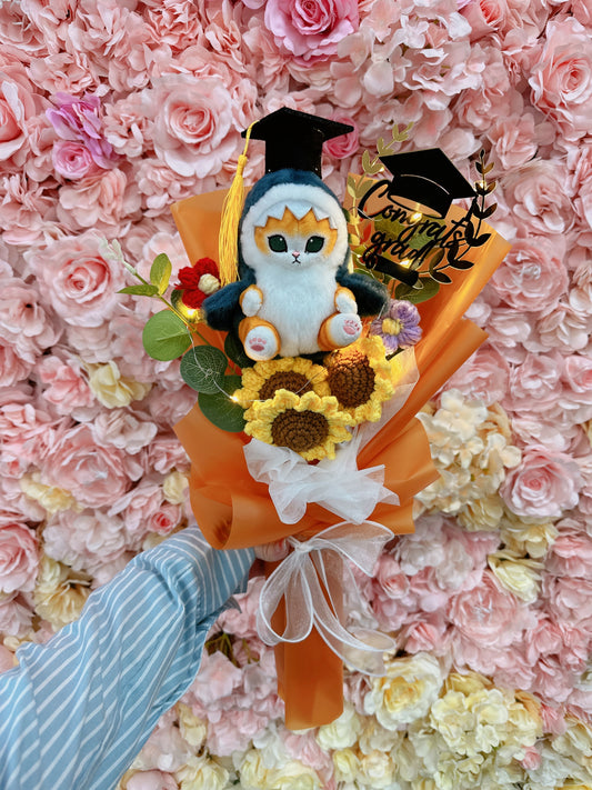 Mofusand 鯊魚貓畢業公仔花束|向日葵|畢業花束|畢業禮物|畢業公仔|針織花束 編織花束 鈎織花束|幼兒園 小朋友畢業花束|網上訂花|香港花店|觀塘花店